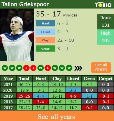 Griekspoor has a composed 36-17 win-loss record in 2021, 23-10 on clay (See FULL STATS).