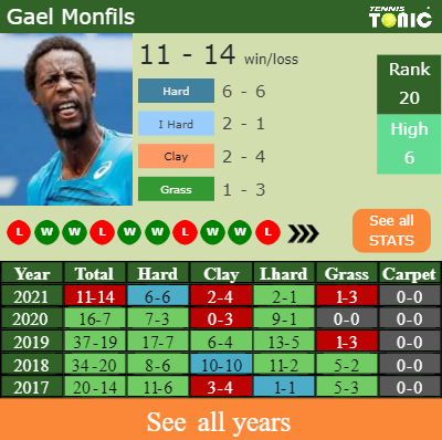Monfils has a solid win-loss record in the last 10 years having won 65% of his matches (289-156). 2-1 on indoor hard courts in 2021. In connection with his performance on the same surface of this event, Monfils has a compiled 72-32 record in the last years on indoor hard courts.