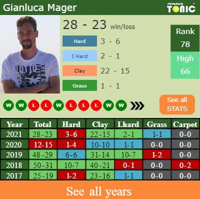 There is no head to head record between Gael Monfils and Gianluca Mager since this will be the first time that they will fight against each other in the main tour.