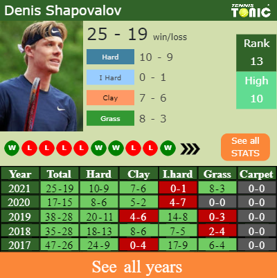 The Canadian has a compiled 25-19 win-loss record in 2021, 10-9 on hard (See FULL STATS).