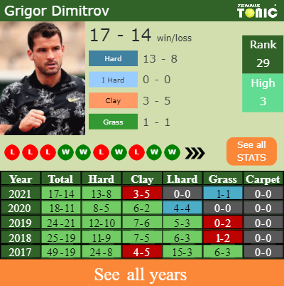 The Bulgarian has a compiled 17-14 win-loss record in 2021, 13-8 on hard (See FULL STATS).