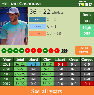Hernan has an aggregate 36-22 win-loss record in 2021, 33-18 on clay (See FULL STATS).