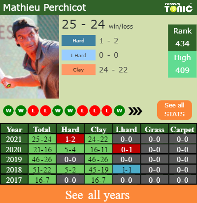 This will be the 2nd time that Alexis Gautier and Mathieu Perchicot play each other. The head to head is 1-0 for Gautier (see full H2H stats), 1-0 on clay.