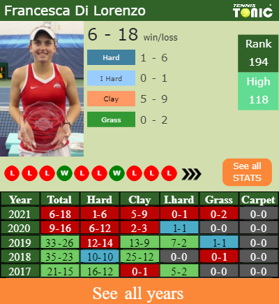 - Francesca Di LorenzoDi Lorenzo – Rebecca MarinoMarino (0-0) – H2H and prediction