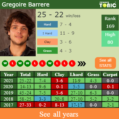 In terms of his career, Barrere has an overall 348-246 record. He has a positive 155-95 record on indoor hard courts.
