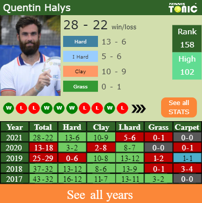 The French player has a compiled 28-22 win-loss record in 2021, 5-6 on indoor hard courts (See FULL STATS).