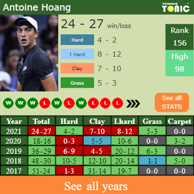 The French player has an aggregate 24-27 win-loss record in 2021, 8-12 on indoor hard courts (See FULL STATS).