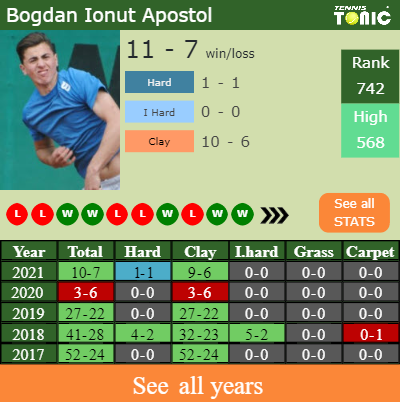 This will be the 2nd time that Raul Brancaccio and Bogdan Ionut Apostol square off. The head to head is 1-0 for Brancaccio (see full H2H stats), 1-0 on clay.