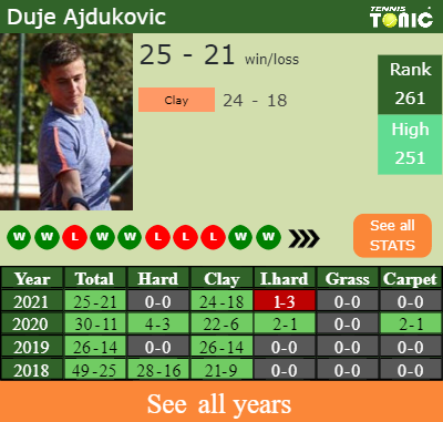 Ajdukovic has an aggregate 25-21 win-loss record in 2021, 24-18 on clay (See FULL STATS).