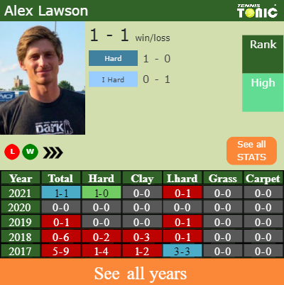 Lawson has a negative win-loss record in the last 2 years having won 26% of his matches (6-17). 1-0 on hard in 2021. Regarding his performance on the same surface of this tournament, Lawson has an aggregate2-6 win-loss record in the last 2 years on hard.