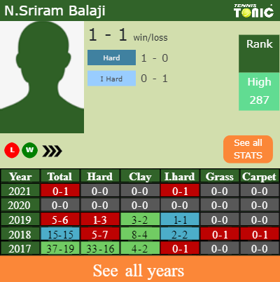 - N.Sriram BalajiBalaji – Alex LawsonLawson (0-0) – H2H and prediction