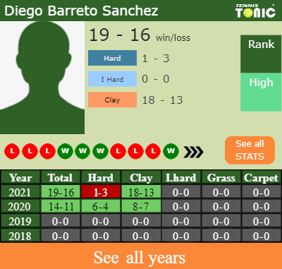 Barreto Sanchez has an overall 19-16 win-loss record in 2021, 1-3 on hard (See FULL STATS).