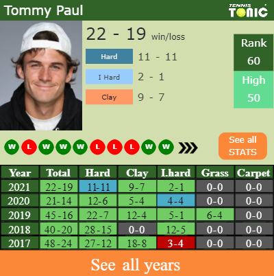 The American has a composed 22-19 win-loss record in 2021, 11-11 on hard (See FULL STATS).