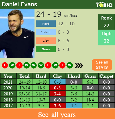 The Brit has a compiled 24-19 win-loss record in 2021, 12-10 on hard (See FULL STATS).