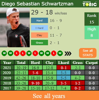 Schwartzman has a compiled 30-19 win-loss record in 2021, 16-9 on hard (See FULL STATS).