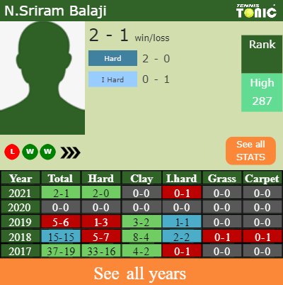 Balaji has a composed 2-1 win-loss record in 2021, 2-0 on hard (See FULL STATS).