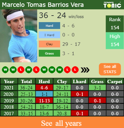 The Chilean has a composed 36-24 win-loss record in 2021, 29-17 on clay (See FULL STATS).