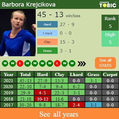 Krejcikova has an aggregate 45-13 win-loss record in 2021, 27-9 on hard (See FULL STATS).