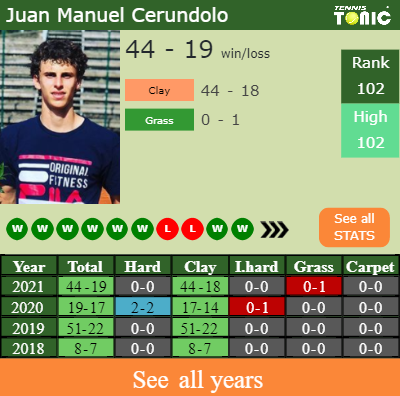 Manuel Cerundolo has a compiled 44-19 win-loss record in 2021, 44-18 on clay (See FULL STATS).