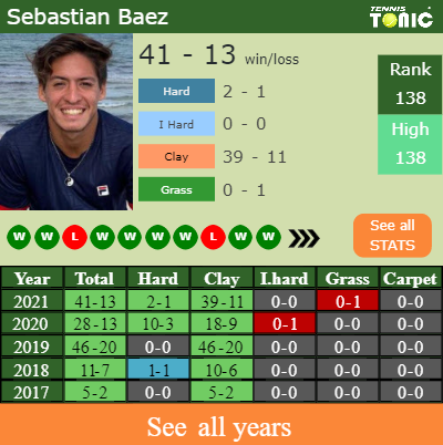 Sebastian has an aggregate 41-13 win-loss record in 2021, 39-11 on clay (See FULL STATS).
