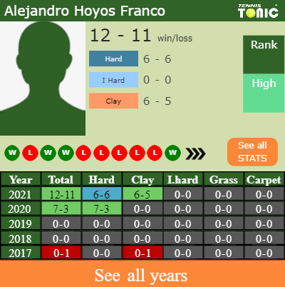 Hoyos Franco has a winning match record in the last 6 years having won 56% of his matches (20-16). 6-5 on clay in 2021. In connection with his performance on the same surface of this tournament, Hoyos Franco has an overall7-7 record in the last 6 years on clay.