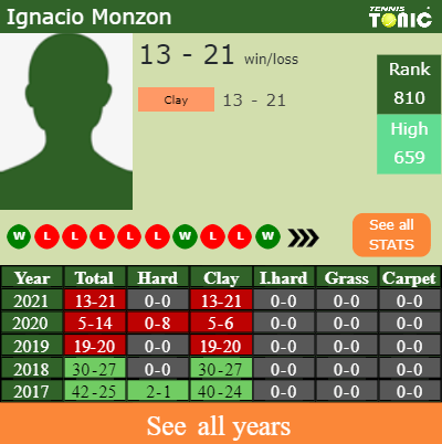 Ignacio has an aggregate 13-21 win-loss record in 2021, 13-21 on clay (See FULL STATS).