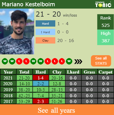 Kestelboim has a solid match record in the last 7 years having won 62% of his matches (259-161). 20-16 on clay in 2021. Regarding his performance on the same surface of this event, Kestelboim has an aggregate229-139 win-loss record in the last 7 years on clay.
