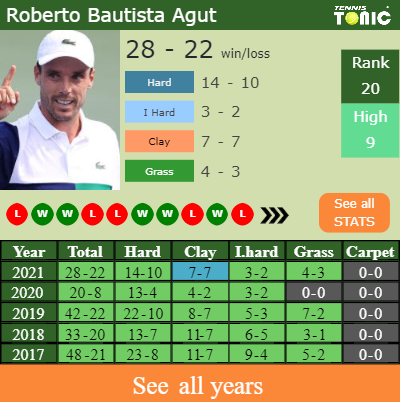 Roberto has an aggregate 28-22 win-loss record in 2021, 3-2 on indoor hard courts (See FULL STATS).