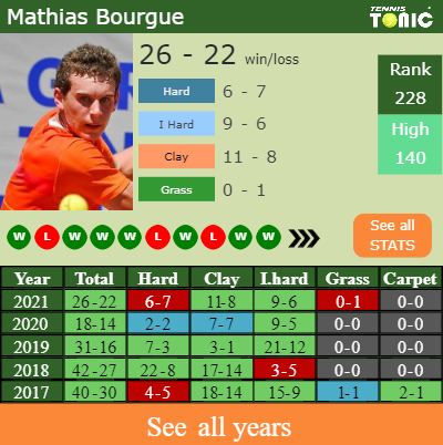 Mathias has a composed 26-22 win-loss record in 2021, 11-8 on clay (See FULL STATS).