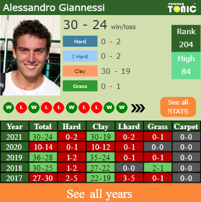 Giannessi has a good win-loss record in the last 10 years having won 53% of his matches (283-246). 30-19 on clay in 2021. In connection with his performance on the same surface of this competition, Giannessi has a compiled 247-192 match record in the last years on clay.