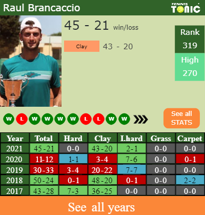 Brancaccio has a composed 45-21 win-loss record in 2021, 43-20 on clay (See FULL STATS).