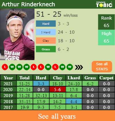 Rinderknech has an aggregate 51-25 win-loss record in 2021, 24-10 on indoor hard courts (See FULL STATS).