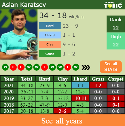 Karatsev has a solid match record in the last 10 years having won 61% of his matches (350-221). 1-1 on indoor hard courts in 2021. In connection with his performance on the same surface of this event, Karatsev has an overall 79-61 record in the last years on indoor hard courts.