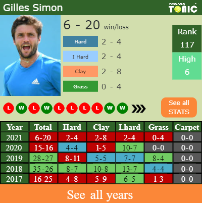 The French player has an aggregate 6-20 win-loss record in 2021, 2-4 on indoor hard courts (See FULL STATS).
