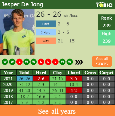 De Jong has an overall 26-26 win-loss record in 2021, 21-15 on clay (See FULL STATS).