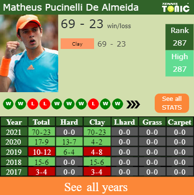 Matheus has a compiled 70-23 win-loss record in 2021, 70-23 on clay (See FULL STATS).