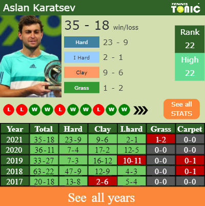 Aslan has an aggregate 35-18 win-loss record in 2021, 2-1 on indoor hard courts (See FULL STATS).