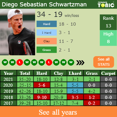 Schwartzman has a solid record in the last 10 years having won 62% of his matches (405-246). 3-1 on indoor hard courts in 2021. Talking about his performance on the same surface of this event, Schwartzman has an aggregate 27-23 win-loss record in the last years on indoor hard courts.