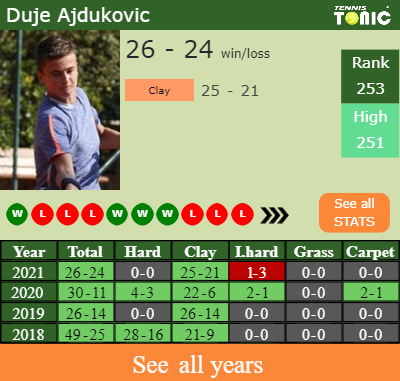 Ajdukovic has a composed 26-24 win-loss record in 2021, 1-3 on indoor hard courts (See FULL STATS).