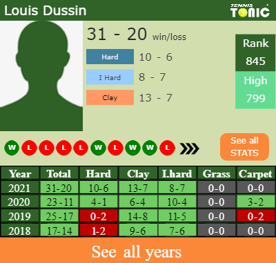 In terms of his career, Dussin has an overall 96-62 record. He has a positive 36-22 record on indoor hard courts.