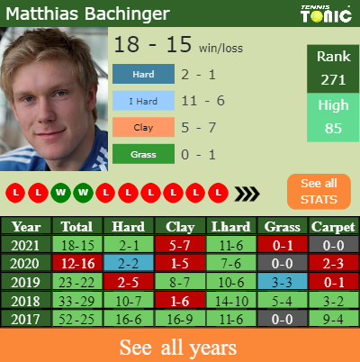 Matthias has a compiled 18-15 win-loss record in 2021, 0-0 on carpet (See FULL STATS).