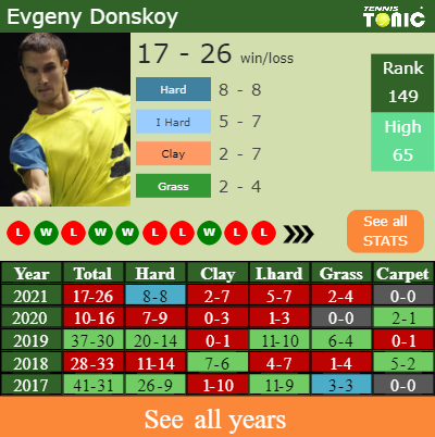 Evgeny has an aggregate 17-26 win-loss record in 2021, 5-7 on indoor hard courts (See FULL STATS).