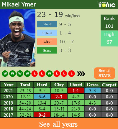 Ymer has an aggregate 23-19 win-loss record in 2021, 1-4 on indoor hard courts (See FULL STATS).
