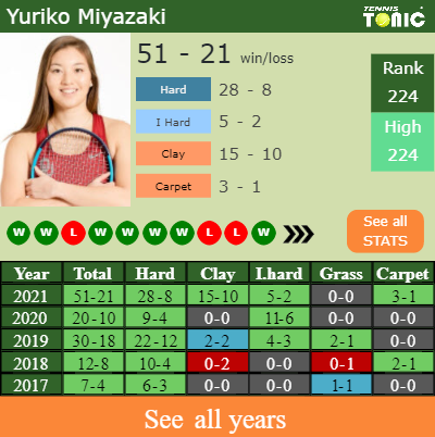 The Japanese has an aggregate 51-21 win-loss record in 2021, 5-2 on indoor hard courts (See FULL STATS).