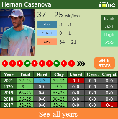 The Argentine has an overall 37-25 win-loss record in 2021, 34-21 on clay (See FULL STATS).