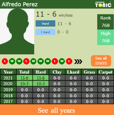 In terms of his career, Alfredo has an overall 21-9 record. He has a positive 21-9 record on hard.