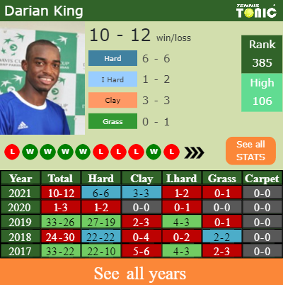 This will be the 2nd time that Darian King and Donald Young fight against each other. The head to head is 1-0 for King (see full H2H stats), 1-0 on hard.