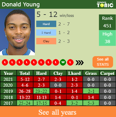 Donald has a compiled 5-12 win-loss record in 2021, 2-7 on hard (See FULL STATS).