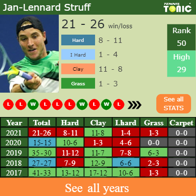 Jan-Lennard has a composed 21-26 win-loss record in 2021, 1-4 on indoor hard courts (See FULL STATS).