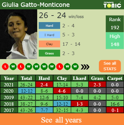 Gatto-Monticone has a winning record in the last 10 years having won 59% of her matches (322-221). 5-3 on indoor hard courts in 2021. Regarding her performance on the same surface of this event, Gatto-Monticone has a compiled 55-39 record in the last years on indoor hard courts.